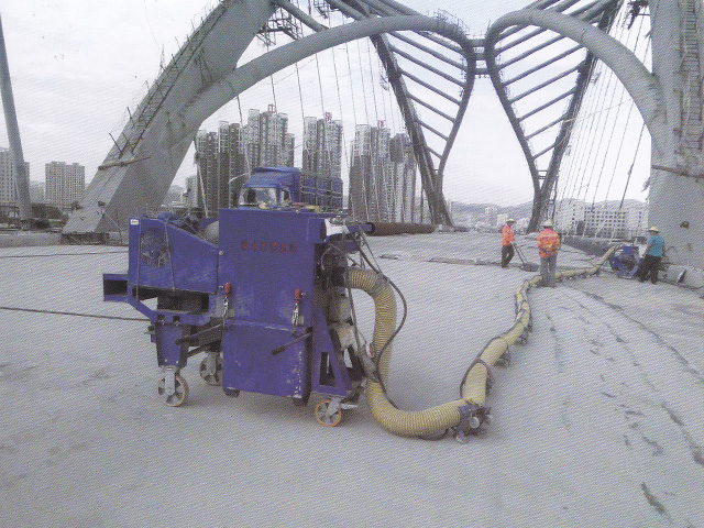 橋梁混凝土鋪裝層處理采用拋丸工藝,即利用拋丸機(jī),拋除混凝土表面的浮漿。使用拋丸處理的表面粗糙均勻;不會破壞原混凝土結(jié)構(gòu)和平整度,并且可以完全去除浮漿和起砂,100%“創(chuàng)面”、露骨;但同時不會造成骨料的松動和微裂紋,為增強(qiáng)混凝土與瀝青面層提供更好的粘結(jié)。