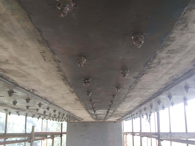 用粘結(jié)劑粘貼鋼板補(bǔ)強(qiáng)、加固的鋼筋混凝土結(jié)構(gòu)構(gòu)件,能大大提高其原設(shè)計(jì)承載力和抗破壞能力。這是因?yàn)檎迟N鋼板后,提高了原結(jié)構(gòu)構(gòu)件的配筋量,相應(yīng)就提高了結(jié)構(gòu)構(gòu)件的抗拉、抗彎、抗剪等方面的力學(xué)性能,而這些性能是靠結(jié)構(gòu)膠粘劑的良好粘結(jié)性能,把鋼板與混凝土牢固地粘結(jié)在一起,形成整體,有效地傳遞應(yīng)力,共同工作來(lái)保證的。